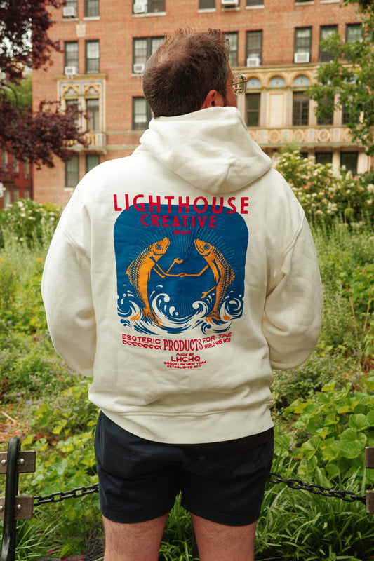 These salted mackerel have escaped their tin, courtesy of our ultrasoft cotton hoodie. Do they part ways to escape detection, or march together into the unknown? C'est à toi de voir.