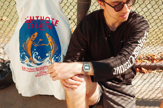 Our signature lightweight tee features long sleeves with a gothic script bearing our own mark--and on the back, occult symbols of obscure meaning which align powerfully with your spinal chakra.